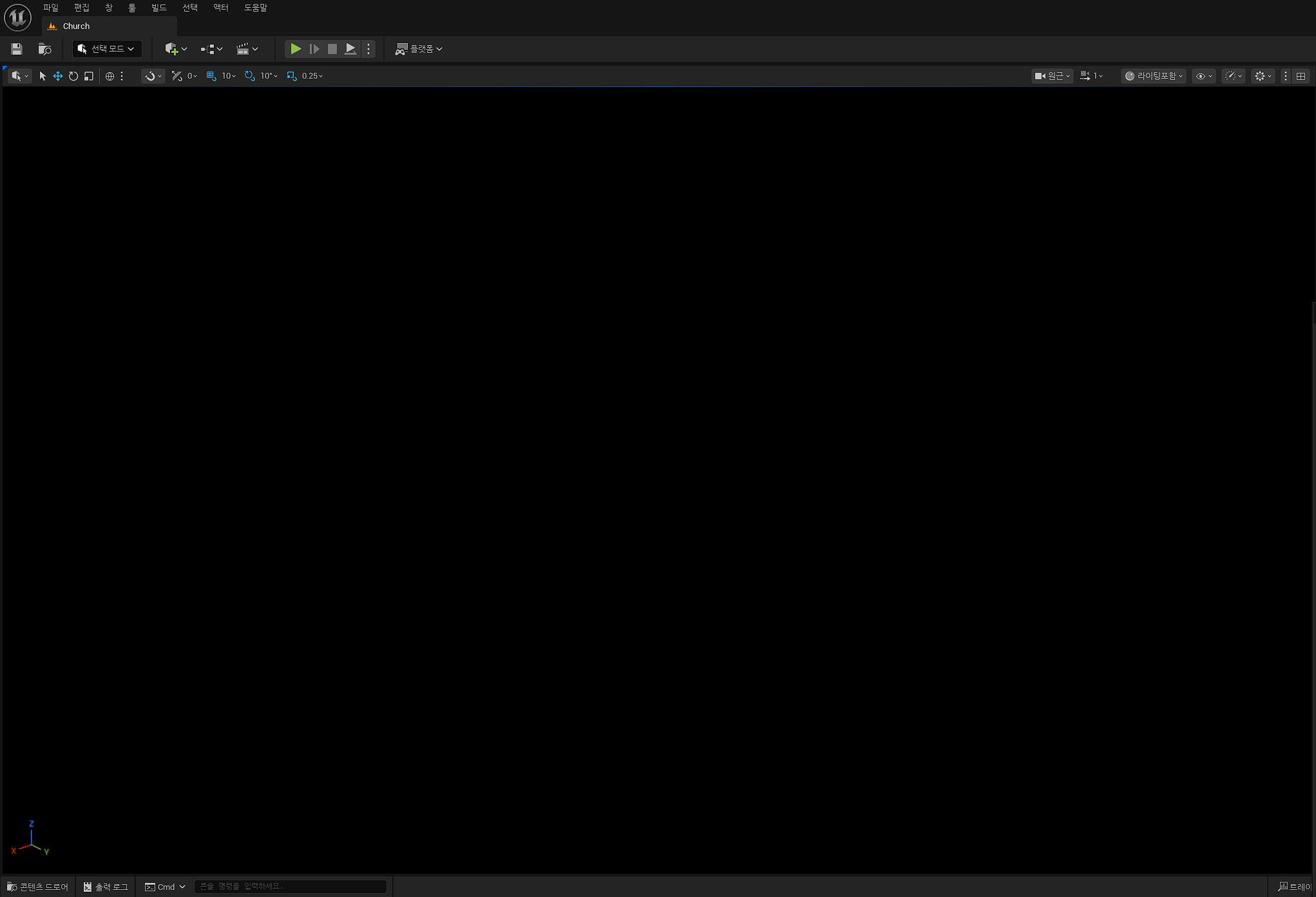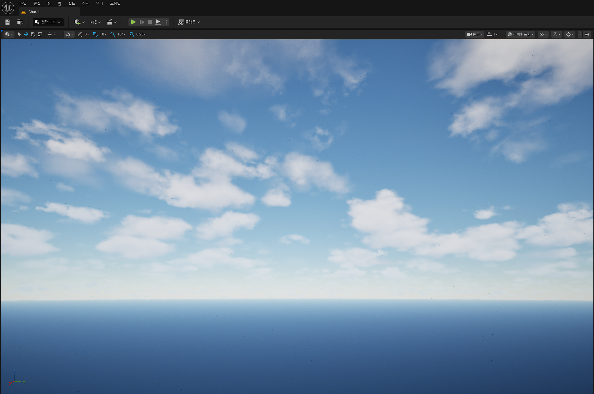 새로운 레벨을 만들어서 뷰포트에는 아무것도 없는 모습이다. 자연스러운 하늘과 빛을 넣어주도록 하자.