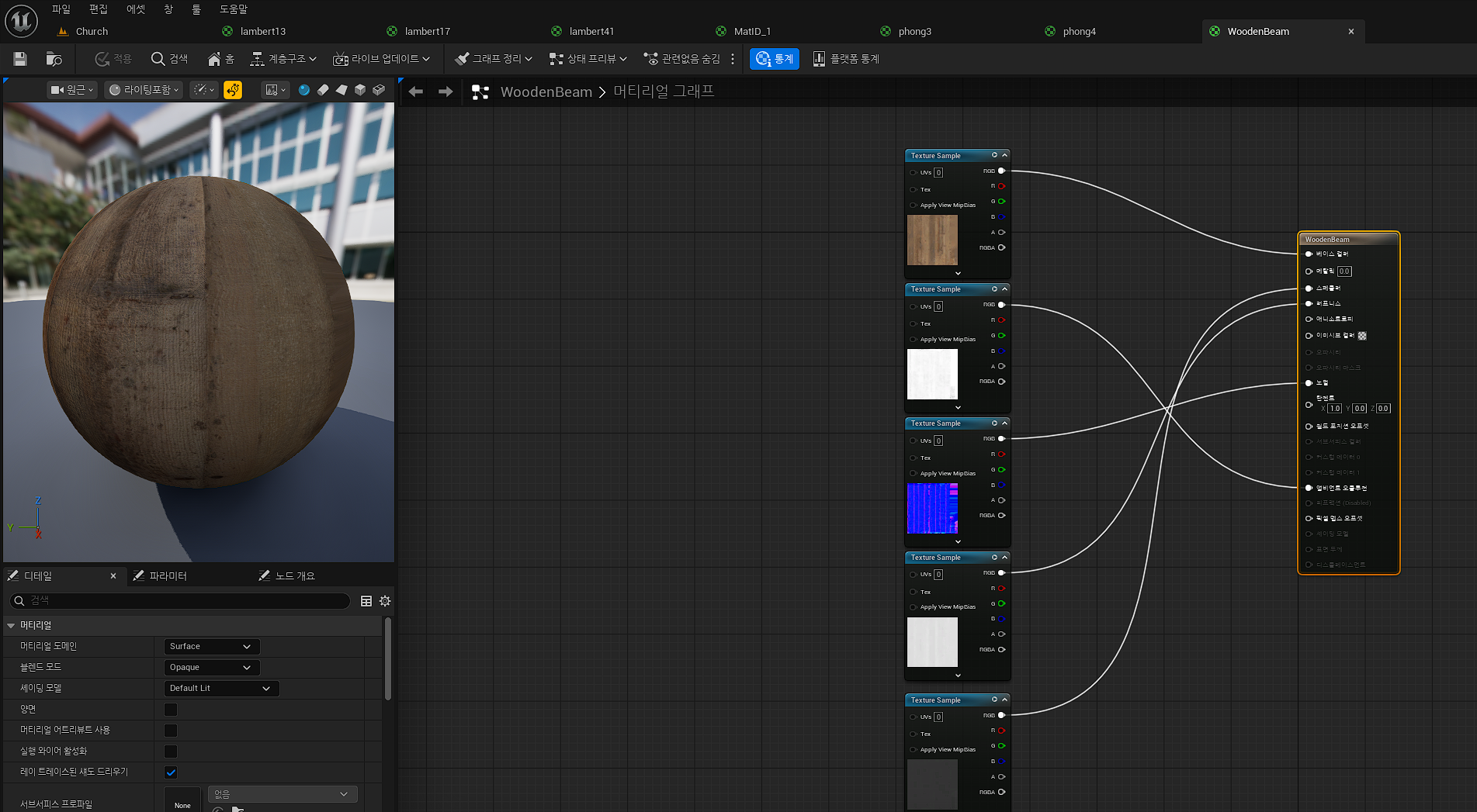 또한 목재 골조를 만들기 위해서 wooden beam 에셋을 구해서 다음과 같이 머터리얼을 만들어서 적용해 주었다.