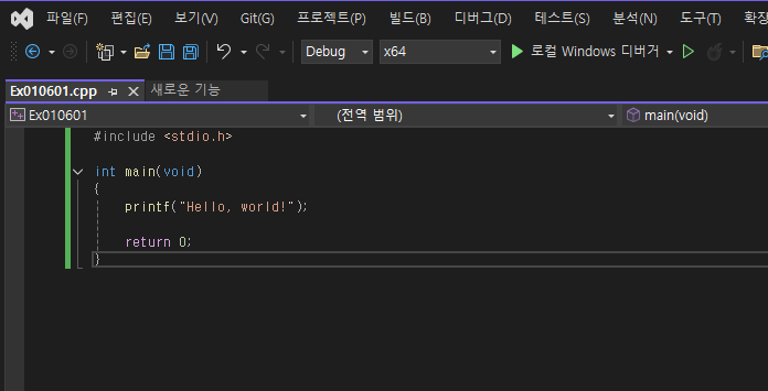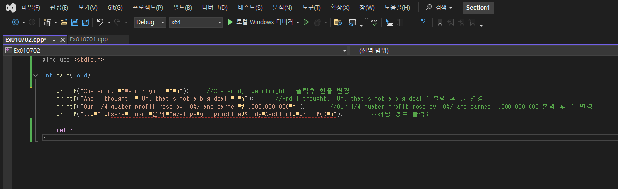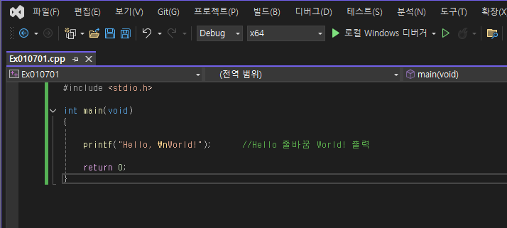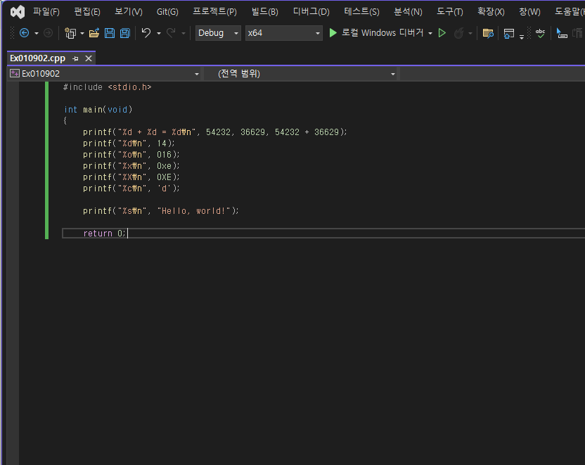 결과는 아까와 같다. 다음은 변수이다. 수학에서 익히 들어봤듯 변할 수 있는 수이다. 코드를 작성함에 있어서 변수를 선언할 때가 있는데 항상 변수는 해당 스코프의 최상단에 위치시켜야 한다고 한다. 단 C++에서는 원하는 위치에 선언하고 사용해도 된다 하는데 소스코드가 많아질 경우 변수 선언 위치와 사용 위치가 멀어져서 가독성이 떨어지기 때문이라고 한다.