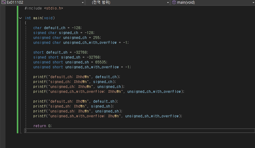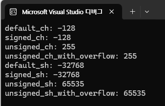 signed는 부호 있게, unsigned는 부호가 없이 표현하는 대신 양수 부분의 값이 2배로 늘어난다 그럼 결과는 다음과 같다.