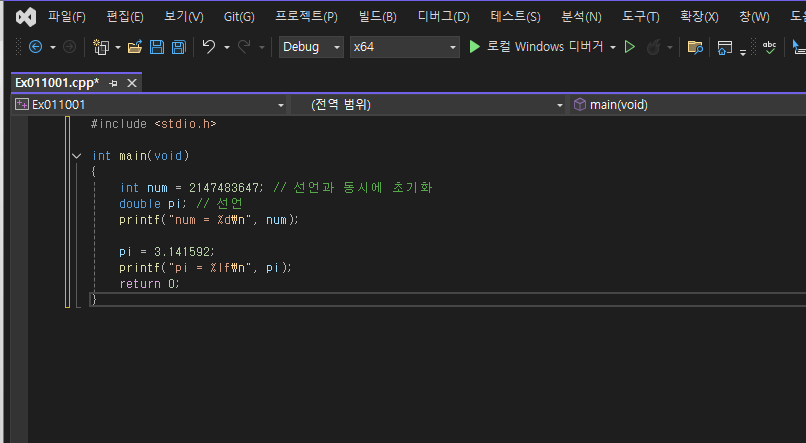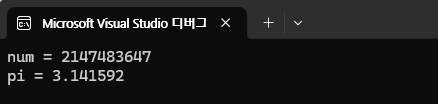 전체적인 흐름을 보자 메인 함수에서 num은 2147483647이라 선언하고 pi를 선언한다(double은 위의 자료형 참고) num 값을 십진수로 표현한 뒤 줄을 바꾸고 pi = 3.141592라 선언하고 pi값을 %lf 조건서식에 맞추어 표현해 준 뒤 함수를 마치는 것으로 보인다 한번 보자.