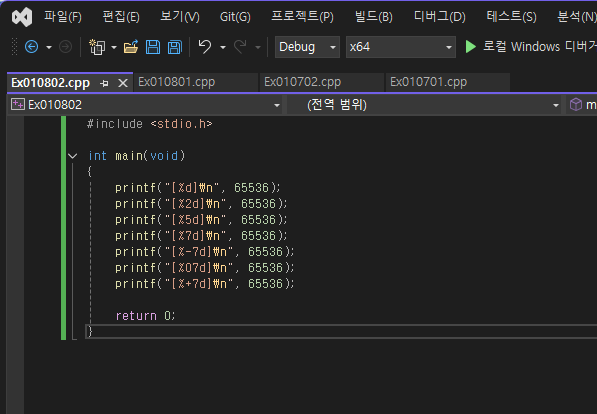 뭔가 %d가 10진수이니 %2d는 뭐 20진수인가 싶다가도 %-7d는 또 뭐고 무슨 서식 지정자인지 도저히 모르겠다 과연 이 예제는 어떤 결과를 출력할까?
