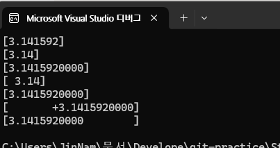 검색해 보면 %f는 소수점으로 표기하는 서식 지정자로서 소숫점 아래 6자리 까지 표현하는게 기본이라고 한다. 그렇다면 첫번째는 분명히 [3.141592]로 출력되면서 줄이 바뀔건데 그 다음은 소숫점 아래 2자리 까지 표현하는 건가? 그럼 %5.2f는 어떻게 나오는 건지 감이 안 온다 한번 결과 값을 보자