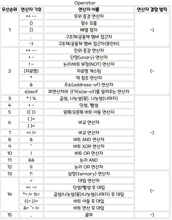 어제에 이어서 오늘도 C언어에 대해서 공부해 보자 오늘은 연산자에 대한 내용이다. 연산자는 흔히 우리가 수학에서 사용하는 사칙연산과 같은 +, -, *, / 와 같은 사칙연산과 고등교육기관의 수학을 배웠다면 들어봤을 법한 논리연산(집합으로 치면 교집합, 합집합과 같은)등이 있고 C언어도 마찬가지로 다양한 연산자가 있다. 일단 연산자(Operator)와 피연산자(Operand)를 알아야 한다. 연산자는 앞서 설명한 덧셈(+), 뺄셈(-)과 같은 기호를 말하며 피연산자는 5 + 2에서의 5와 2처럼 연산이 되는 대상을 뜻하는 의미이다. 정해진 연산자와 피연산자를 통해서 코드를 작성하면 컴퓨터가 결과를 출력하는데 우리가 덧셈보다는 곱셈이 먼저, 괄호가 있다면 괄호 안의 연산을 먼저 해야 한다고 배웠듯 C언어에서의 연산자 또한 우선순위가 있고 그는 다음과 같다.