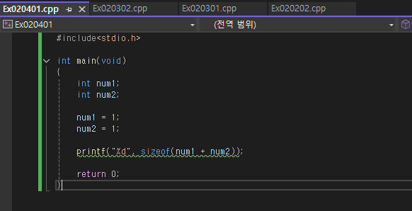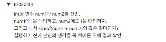 sizeof 연산자에 관한 내용이다 sizeof는 단항 피연산자를 가지며 피연산자의 자료형 크기를 바이트 단위로 반환한다고 한다 int형의 자료형은 4바이트의 크기를 가지기 때문에 다음과 같이 코드를 작성하면