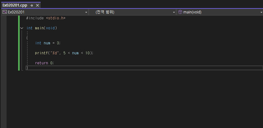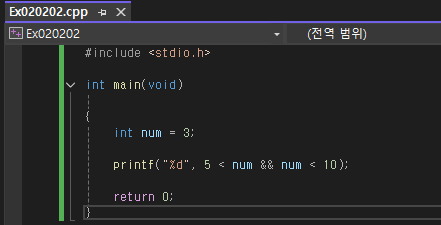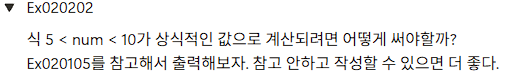 자 그러면 5 < num < 10은 어떻게 연산되는걸까? 좌로부터 우로 연산이 진행되면서 순서대로 연산이 진행되기에 5 < num이 먼저 진행될 것이다. num=3 이므로 값은 false에 해당하는 0이 출력될 것이다. 그러면 남은 연산은 0 < 10이 되어 true에 해당하는 1이 출력되게 된 것이다. 우리가 최초에 원하는 올바른 값을 출력하기 위해선 논리연산을 그중에서도 논리곱을 이용하여 식을 표현해야 우리가 원하는 연산 결과가 출력될 것이다. 그 예제이다.