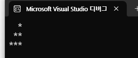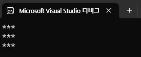 이번엔 for문을 이용한 이중 반복문이다. i, j를 변수로 선언 후 첫번째 for문에서 i는 1로 시작한다 그 다음 두번째 for문을 진행할때 마찬가지로 j도 1로 시작하여 j가 3보다 작거나 같으면 *을 출력하고 두번째 for문의 명령이 끝났으므로 두번째 for문의 처음으로 돌아간다.(아직 첫번째 for문의 명령은 안끝났다) 마찬가지로 반복하여 j는 2가되고 *이 출력되고 j값이 1추가되어 반복 j가 3이 될때까지 반복된다. j가 4가되어 for의 조건문을 충족하지 못하기 때문에 그 다음줄로 이행하면 줄바꿈을 하게 되어있다. 그러면 첫번째 for문의 명령도 종료되어 다시 첫번째 for문 부터 시작 i값에 1이 추가되어 두번째 for문으로 이동 또 반복...