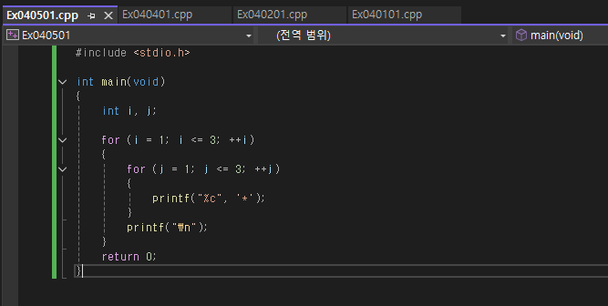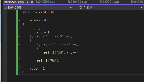 이를 이용하여 어떻게 소스코드를 짤지 구상해보자 일단 변수는 i와 j를 선언해준다. 위의 예제처럼 for문을 이용한 이중 반복문으로 i는 3보다 작거나 같을 때 까지, j는 4보다 작거나 같을때 까지 반복하게 해주면 될것이다. 문제는 각 항마다 커지는 숫자인데 j의 값을 그대로 printf();를 이용하여 출력하자니 줄이 바뀌면 다시 j는 1부터 시작한다. 이를 해결하기위해 cnt를 이용해보았다