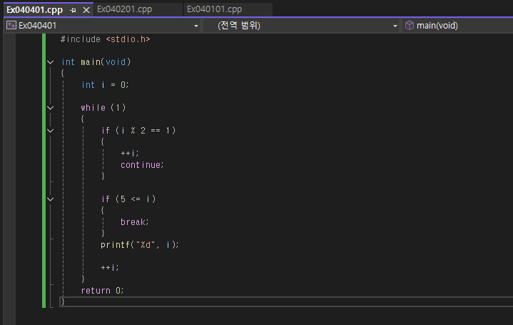 while과 if를 이용한 문제이다. i는 초기값이 0으로 선언한 상태에서 while문에 진입하면 조건이 1이므로 true이고 while구문이 실행된다. 첫번째 if의 조건은 2로 나눈 나머지가 1인지 물어보기에 0을 2로 나누면 나머지는 0 false이므로 두번째 if문으로 넘어간다 두번째 if문은 5보다 i가 크거나 같은지 물어보기에 당연히 false i값을 출력하고 ++i로인해 i값이 1이 증가한다 이를 반복하면