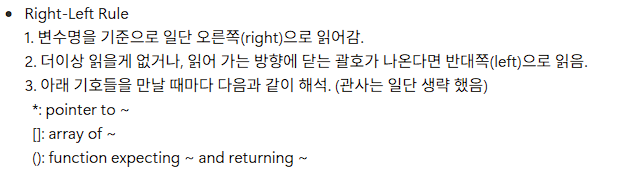 Right - Left 법칙을 이용하면 var is array of pointer to int로서 "var는 int 자료형을 가리키는 포인터의 배열이다." 이번엔 한번 포인터를 선언해 보자 int자료형을 반환하며 인자로 int자료형의 num을 받는 함수 yes의 메모리주소를 저장할 포인터를 선언해 보자.