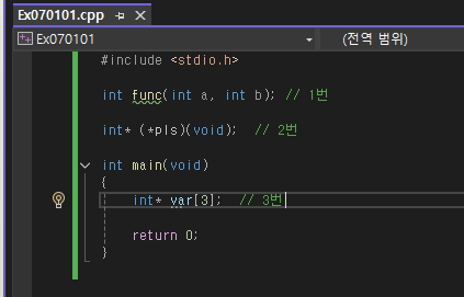 이러한 형태에서 참고하여 포인터는 다음과 같이 선언할 수 있다.
