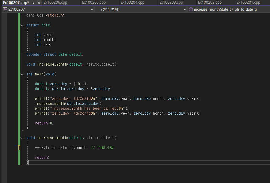 다만 주의사항 줄을 잘 보도록 하자 ++연산자보다. 연산자가 더 우선순위에 있기에 반드시 둘을 사용할 경우 괄호를 쳐주는 것이 좋다. '.' 말고도 구조체 멤버 접근 연산자로는 '->'가 있다. 구조체 포인터에 역참조 연산자와 '.'연산자를 합친 연산자로서 우선순위가 1순위인 연산자이기 때문에 위의 상황처럼 괄호를 칠 필요가 없다.
