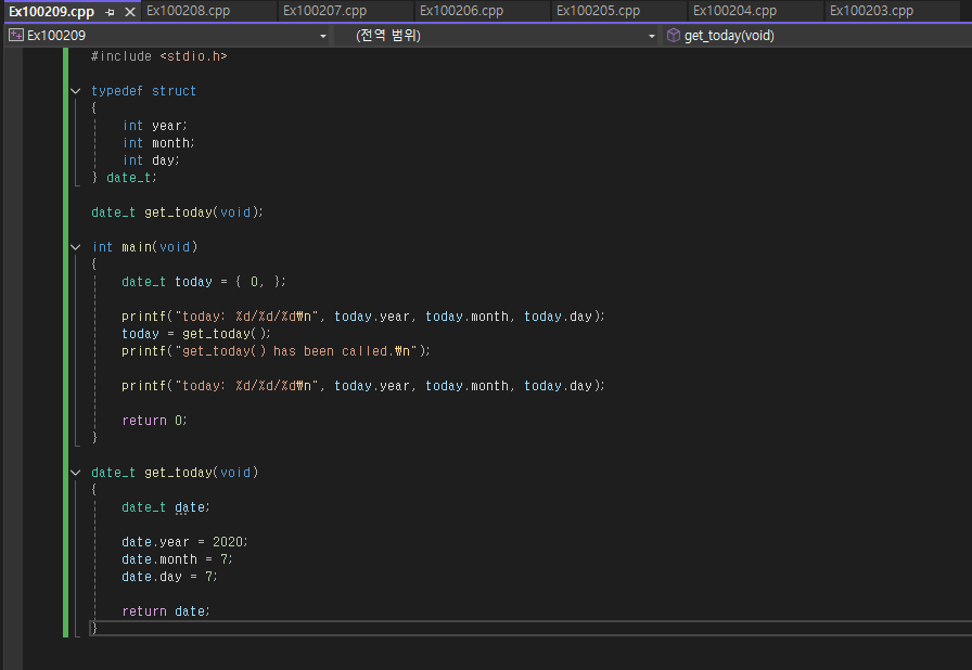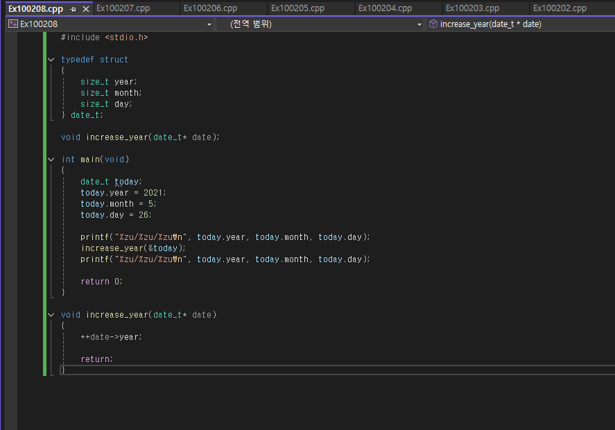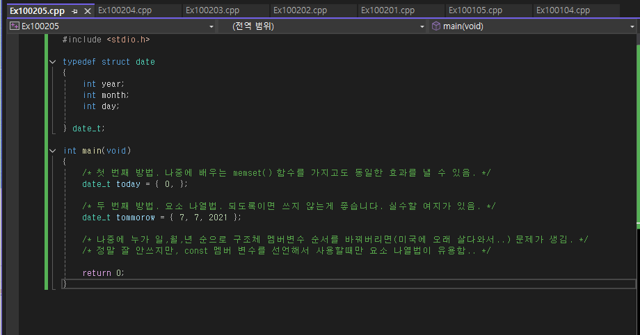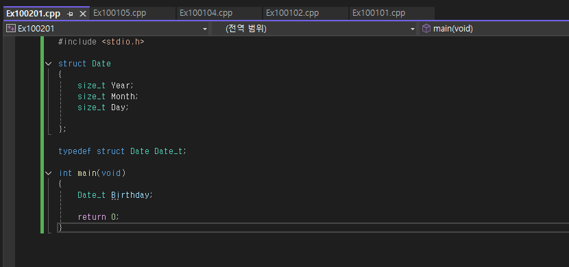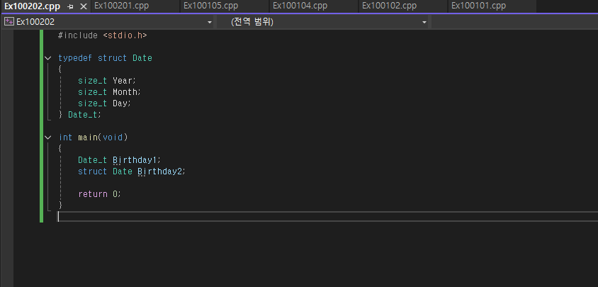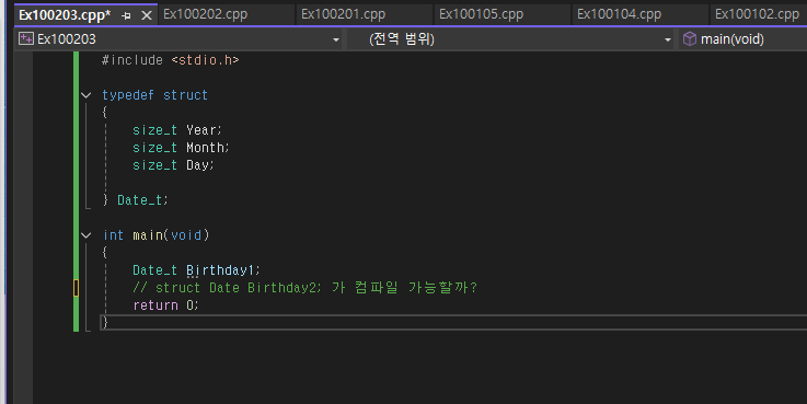 과연 저 struct Date Birthday2; 가 컴파일이 가능할까? 정답은 안된다 왜냐면 우리는 Date라는 스트럭처를 선언하지 않았기 때문! Date_t Birthday2; 라 선언해야 될 것이다.