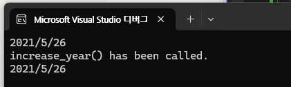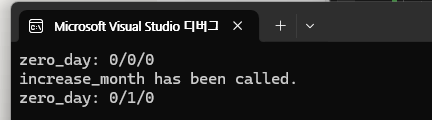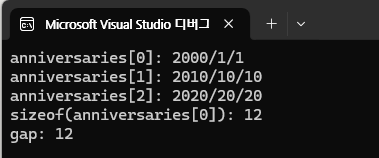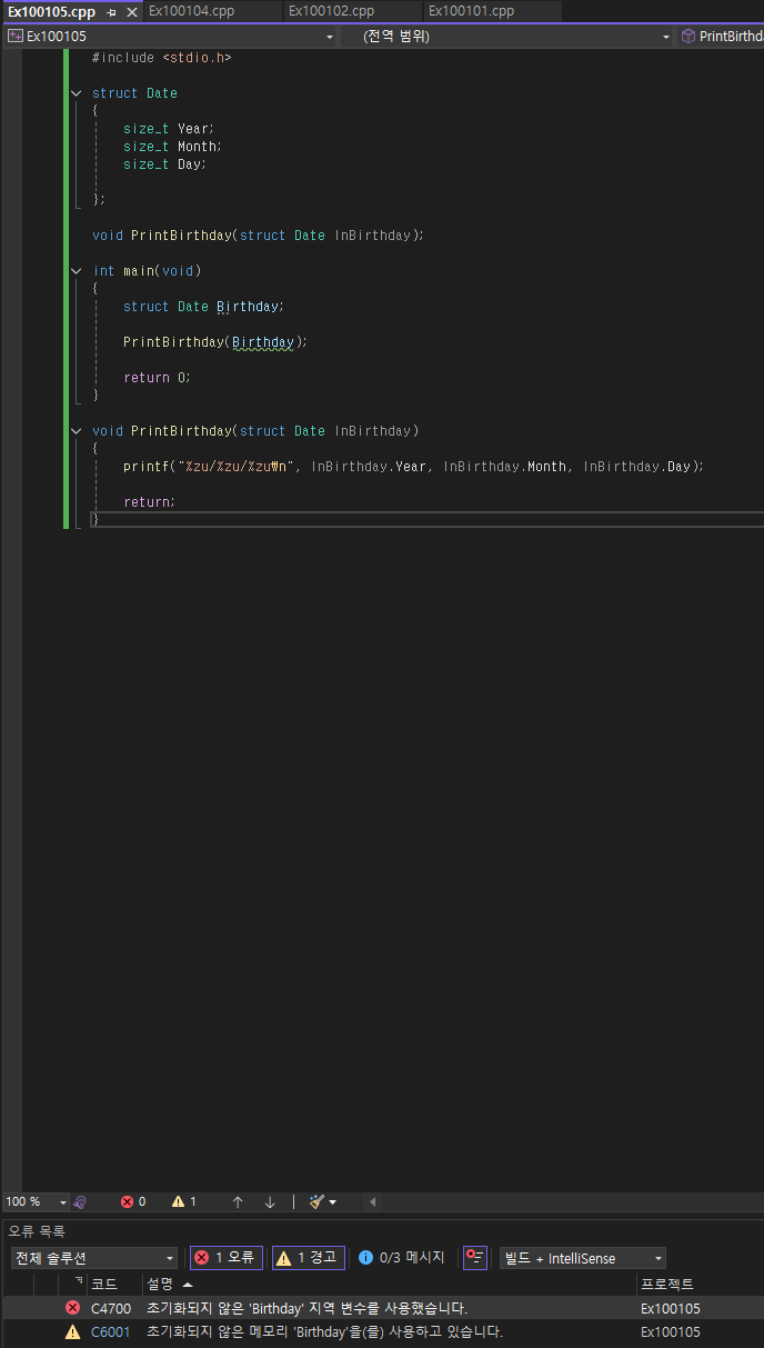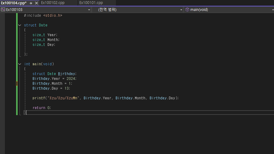 Date라는 구조체의 자료형 변수 Birthday라고 우리는 이미 선언해 두었다 여기서 Year에 값을 넣기 위해서는 위와 같이 Birthday.Year로 구조체 멤버 연산자를 사용해서 작성한 후 그 수를 대입해주면 된다. 그럼 값이 올바르게 출력되는지 보도록 하자.