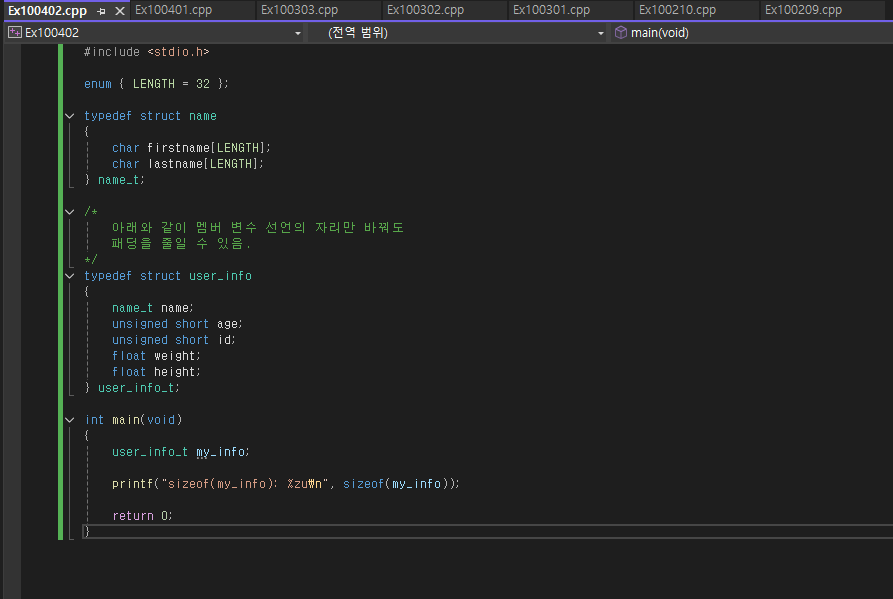 바이트 정렬 요구사항은 시스템별로 메모리에 효율적으로 접근하기 위해서 n바이트 배수인 시작주소에서만 메모리 접근이 가능하게끔 한다. 대표적으로 x86시스템은 4바이트(== 워드크기) 경계에서 읽어오기 때문에 4바이트마다 정렬(aligned)되어 있다. 따라서 각 컴파일러가 알아서 각 멤버의 시작 위치를 그 경계에 맞춰준다. 그렇기 때문에 위의 결과가 나온 것이다. 왜? 크기가 2 바이트건 8 바이트건 4바이트 단위로 끊기 때문에 2바이트 다음으로 4바이트짜리 자료가 온다면 2바이트짜리를 채우고 남은 2바이트 공간은 비워두고 다음 값을 받아들이기 때문이다. 이를 패딩(padding)이라고 한다. 서로 다른 시스템에서 저장한 파일을 불러올 때 바이트 정렬 요구사항이 다르다면 데이터가 꼬일 수도 있다. 그럼 패딩을 줄이는 게 용이하지 않을까? 그렇기 위해서 다음 예제처럼 작성해 주면 된다.