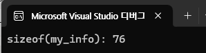 아까는 80이 나왔던 그 예제인데 다른 점은 무엇일까? 각 멤버변수의 순서를 바꾸어 주었다. 순서대로 64바이트, 2바이트, 2바이트, 4바이트, 4바이트 순서로 선언되어 패딩의 작업이 필요 없이 깔끔하게 자료가 들어가게 되었다. 그렇기에 76바이트의 공간이 알차게 쓰인 것을 알 수 있다.