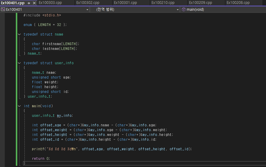 를 연산하면 두 포인터 주소 간의 떨어진 거리 즉 my_info.name의 크기가 나오고 이는 각 크기가 32인 멤버를 갖고 있는 구조체이므로 64가 나오게 될 것이다.(음수던 양수던 간에) 그러면 각 값 또한 계산하면 64, 2, 4, 2가 나와야 할 것이다 결과를 볼까?