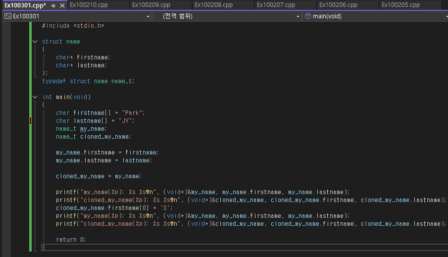 그렇기에 변수선언할 때 처럼 선언 때 초기화 해주는 걸 습관화하도록 하자 앞에서 구조체를 사용할 때 앞에 struct를 기입해서 이것이 구조체라는 것을 명시해야 할 필요가 있다고 했다. 사실 구조체도 자료형처럼 struct 키워드를 빼고 자료형만 적을 수 있고 이게 훨씬 편리하다. 이때 사용하는 것이 typedef, type definition의 약자로서 이미 정의되어 있는 자료형에 새로운 별명을 지어준다.