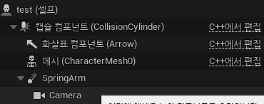 컴포넌트에서 캐릭터를 눌러준 후 추가를 눌러 spring arm 컴포넌트와 camera 컴포넌트를 추가해 준다