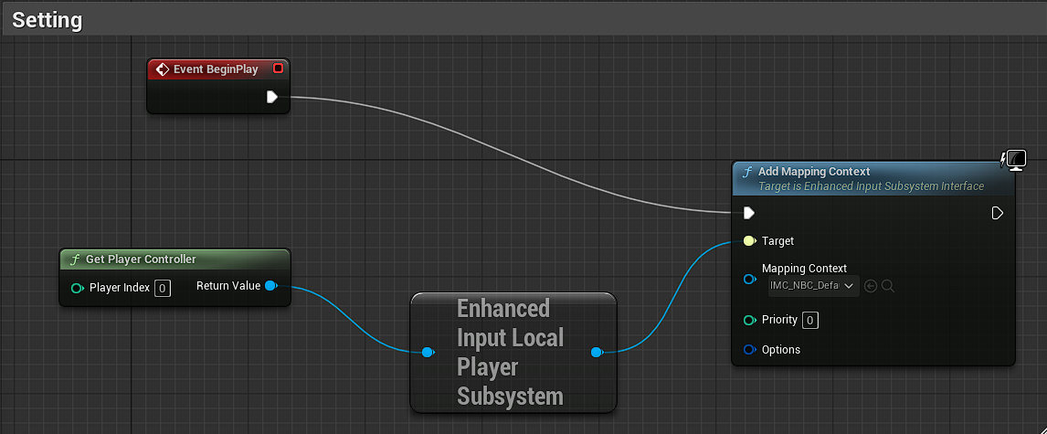 이제 플레이어 캐릭터인 액터가 생성되면 Get player controller를 통해 현재 플레이어의 컨트롤러 인풋을 사전에 매핑한 값으로 지정해 주게 된다.
