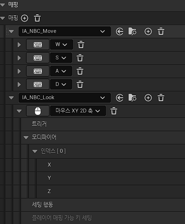 이어서 매핑 콘텍스트에서는 캐릭터를 움직일 키 예컨대 WASD와 시점을 변경해 줄 동작(마우스의 XY 2D 축)을 설정해 준다.