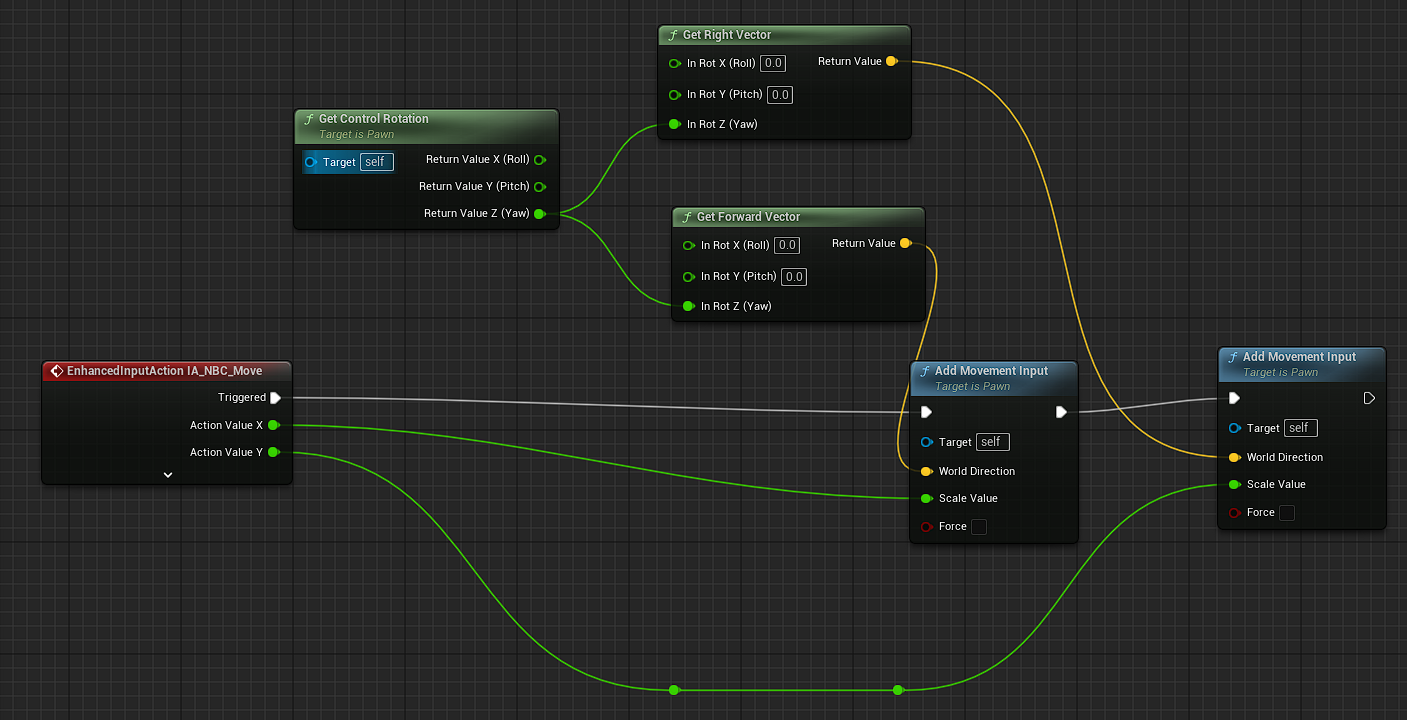 Get Actor Forward Vector, Get Actor Right Vector 이 2개의 노드들에서 월드를 기준으로 액터의 로컬 방향을 가져와서 월드 좌표계에서의 단위 벡터로 반환한 수를 받아 인풋 액션의 X, Y 값만큼 이동시켜 준다고 강의서에서 설명하는데 월드의 좌표를 기준으로 액터의 방향을 가져온 뒤 월드에서의 벡터로 반환해 주고 그 값만큼 액터를 이동시키는 듯하다.