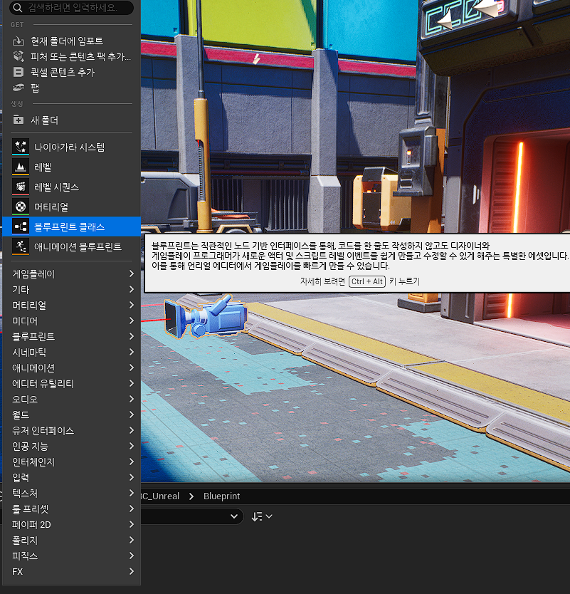 일단 콘텐츠 탭 - Blueprint 폴더를 앞으로 만들 콘텐츠 등을 구분하기 쉽도록 만들어둔다.