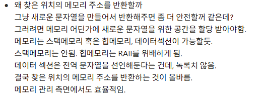 str문자열에 substr문자열이 포함되어 있다면 str문자열 속 첫 substr문자열의 시작주소를 반환한다. NULL포이넡가 반환된다면 없다는 뜻이다. 여기서 주의할 것은 매개변수로 받는 str은 const char*이지만 반환 자료형은 char*으로 const가 사라진다 그렇기에 인자로 데이터 섹션의 read only에 위치하는 문자열을 전달하면 안 된다고 한다.(필자도 이게 무슨 소리인지 아직은 모르겠지만 그렇다고 한다.) 다음은 참고하면 좋은 내용이다.