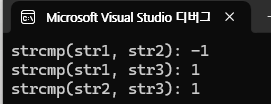 이를 통해서 strcmp(a, b)의 작동 원리를 살펴보자 a를 기준으로 a가 b보다 앞에 오게 된다면 음수(-1)를 a가 b보다 뒤에 있다면 양수(+1)를 출력한다 여기서 주의해야 할 것은 -1이 나왔다고 해서 1칸 앞에 있다는 것이 아니라는 것이다. 숫자는 신경 쓰지 말고 부호만 신경 써 음수가 나오면 앞에 있다는 것을, 양수가 나오면 뒤에 있다는 것만 기억해 두도록 하자.