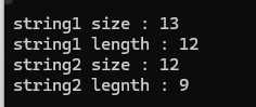 하나의 문자열에는 크기를 정해주지 않고 값을 Hello world! 를 넣었고 다른 하나의 문자열에는 LENGTH값 12를 크기로 정해주고 Goodbye~! 를 넣어주었다. 첫 번째 출력에서는 string1의 size of 값을, 두 번째 출력에서는 string1의 strlen을 출력하게 되어 있으며 세 번째 출력에서는 string2의 size of 값과 네 번째 출력에서는 strlen 값을 출력하게 되어있다. 우리는 string1의 크기를 따로 지정하지 않았기에 배열의 특성에 따라 입력받은 값의 크기만큼 지정되어 있을 것이다. H, e, l, l, o, ' ', w, o, r, l, d,! 총 12글자의 크기를 갖고 있을 것이다. string2는 어떨까? 이미 12만큼의 크기를 받았으니 12가 출력될 것이다. 결과를 확인해 보자