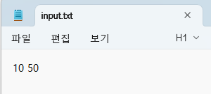해당 코드를 작성해주고 실행결과를 예측해 보자 앞에서 다뤘지만 'r'은 읽기 모드로서 해당 파일이 없으면 오류가 발생한다 그렇기에 input.txt를 프로젝트 폴더에 생성해 주고 숫자 2개를 스캔하도록 되어 있으니 내용은 숫자 2개를 적어보도록 하자 나는 10과 50을 적었다.