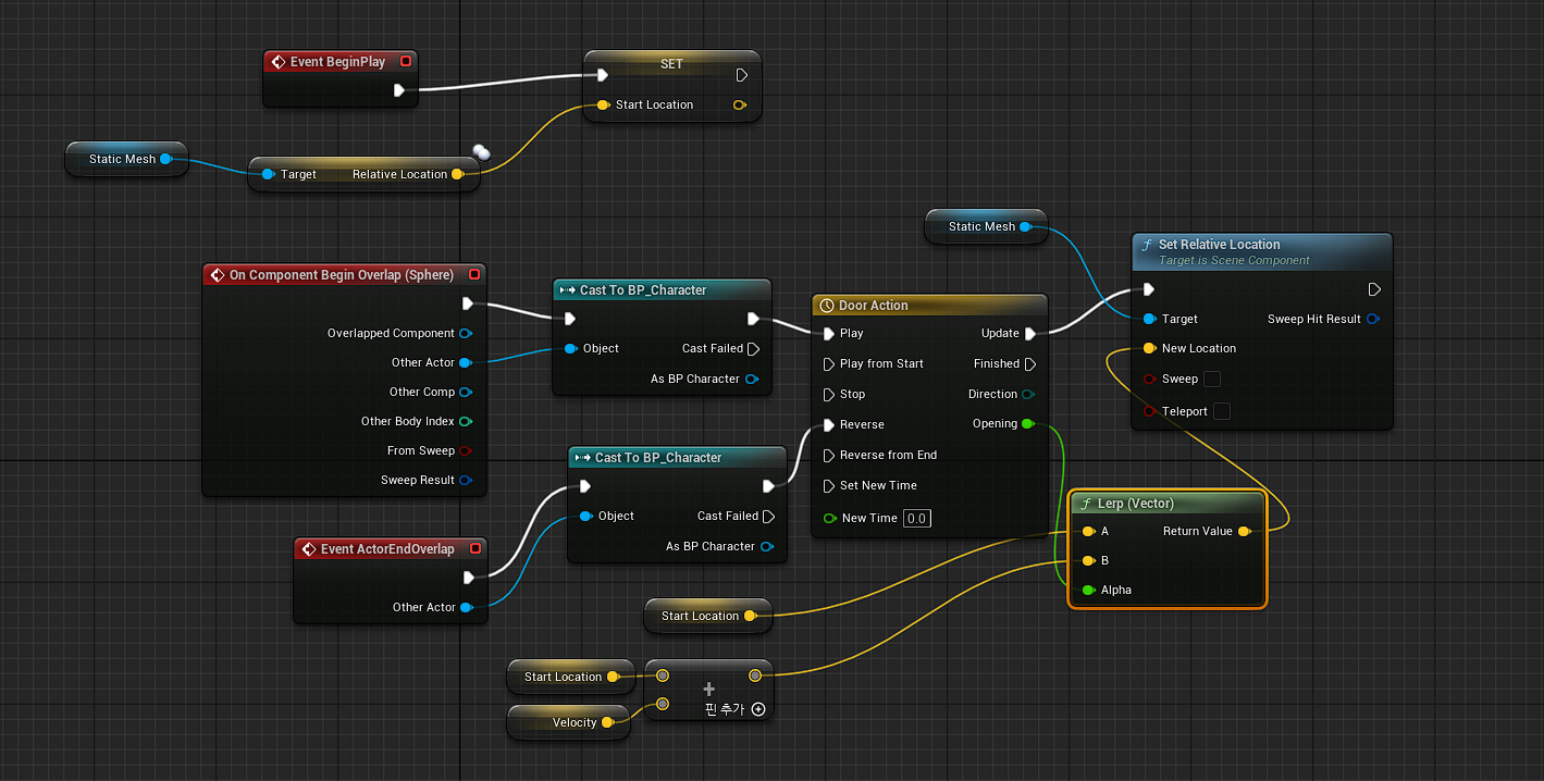 그다음 event tick에 branch를 연결하여 해당 statement 값이 true이면 문이 정방향으로 열리게 false이면 문이 반대 방향으로 닫히게끔 타임라인에 연결해 준 다음 lerp(vector)를 이용하여 시작 위치 값과 종료위치 값(시작위치 + 속도벡터)을 각각 지정해 준 뒤 set actor location 노드에 연결해 주었다.
