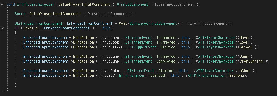 첫째날부터 Character Class, PlayerController Class를 생성하여 언리얼의 EnhancedInputSystem을 이용한 인풋시스템을 구현하려고 하였다. IA로는 Move, Look, Jump, Attack만 각각 생성하여 IMC에 등록하고 C++코드를 통해서 EnhancedInputComponent에 바인딩 해주었다.