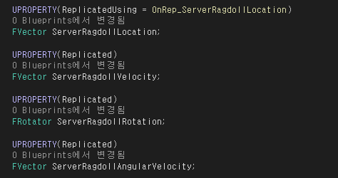 일단 서버에서 레그돌의 물리를 연산하게 하려면 관련 변수들을 레플리케이션에 등록해서 서버가 알게 끔 해야한다 그렇기에 bIsStunned의 경우처럼 관련 변수들을 레플리케이션에 등록해 줘야 하는데 어떤 변수가 필요할까? 멀티플레이 환경에서 내가 보는 화면과 상대방이 보는 화면에서의 기절한 캐릭터의 위치와 모양은 동일할 수록 좋다. 하지만 현재 레그돌된 매시의 물리 시뮬레이션은 각 클라이언트에서 돌리는 상황, 그렇기에 우리는 기절한 캐릭터의 플레이어 클라이언트에서 계산한 물리 값을 서버로 보내고 다시 서버에서 각 클라로 전송해주는 방식으로 해결하려 하고 있다. 이때 사용되는 값으로는 위치(Location), 속력(Velocity), 회전방향(Rotation), 회전력(AngularVelocity) 정도가 되겠다. 이에 해당하는 값을 담을 변수들을 선언해주자 특히 제일 중요한 위치 값은 매쉬의 루트인 골반(pelvis)의 위치를 가져오게 한다.