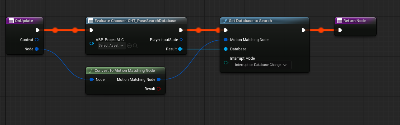 큰 분류로 우선 나누고(Idles, Walks, Runs,... ) 그 내부에 세부 PSD를 배치한 형식이다. 새로 ChooserTable을 생성하기 위해서는 콘텐츠 브라우저를 우클릭하여 Animation > ChooserTable을 골라주면 되며 ABP는 우리가 만든 캐릭터의 ABP를 골라주고 원래라면 Animation Asset을 반환하면 되겠지만 우리는 PSD를 반환하게끔 해야 하니 반환 값에 PoseSearchDatabase를 넣어 PSD를 반환하게 생성해 주자.