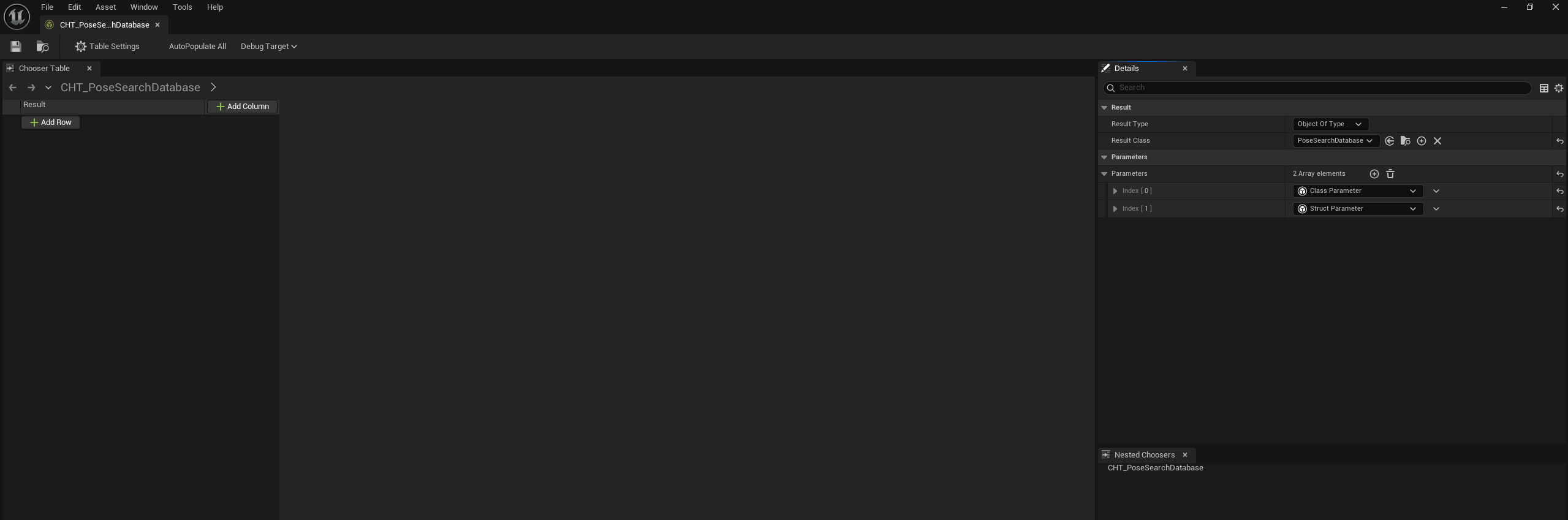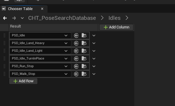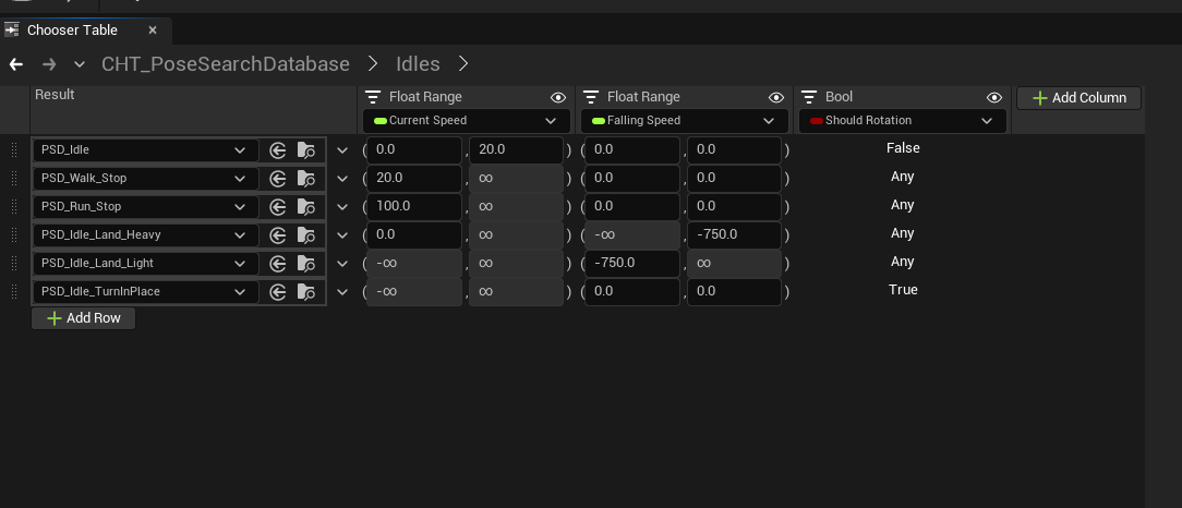 이 구조체의 변수들의 값이 무엇인지를 근거로 ChooserTable이 적절한 PSD를 고르게 될 것이다. 추후에 여기에 bIsFalling과 같은 변수를 추가해서 좀 더 세밀한 애니메이션 선택이 될 수 있게 도와줄 수 있다. 지금 당장은 움직임만 구현해 볼 테니 저 세 변수들로 ChooserTable을 구성해 보도록 하자.