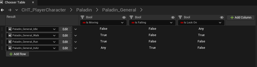 필요한 변수들로는 BP_T3 CharacterBase의 이동 경로를 계산하는 CharacterTrajectory 컴포넌트와 CharacterMovement 컴포넌트 그리고 우리가 추가한 T3 PlayerInputState의 값을 각각 변수로 승격하여 Set 해준다. 이제 준비는 끝났다. 해당 값을 토대로 ChooserTable을 구성해 보자.