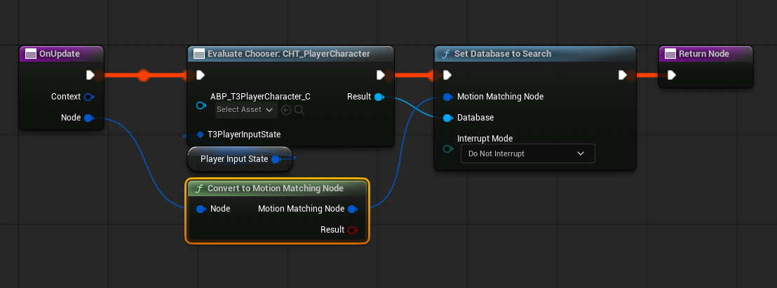 해당 변수들은 기본적으로 false로 되어있고 아직 해당 로직은 작성하지 않았으니 ABP에 연결하는 작업만 시작해 보도록 하자 MotionMatching의 OnUpdate에 새로운 함수를 바인딩해서 다음과 같이 작성해 주고 AnimGraph에서는 다음처럼 작업해 준다.