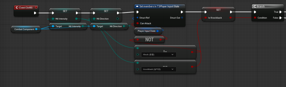 일단 피격이 발생하면 무엇이 필요할까? 일단 팀원들이 작성한 피격, 공격 로직에는 공격을 받은 방향과 대미지 타입을 전달하도록 로직이 구성되어 있고 그 변수들을 가져와서 우리가 처리해야 할 것이다. 그렇기에 Combat Component에 들어있는 변수들을 가져와서 블루프린트 내에서 변수로 승격시켜 주는 작업을 먼저 하자. 일단 OnHit이라는 함수를 캐릭터에서 만들어 TakeDamage 마지막에 해당 함수가 호출되도록 하고 BlueprintImplementableEvent 속성을 부여해서 내부 로직은 블루프린트로 구현하도록 하자. 또한 bool 변수로 bIsKnockBack을 추가하여 현재 상황이 KnockBack인지를 판단하여 경우를 나누어서 작업을 해주어야 할 것이다. 그리고 공격 가능 여부도 체크해 주는 로직 또한 같이 작성해 준다.