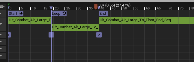 자 플레이어의 입력도 차단했으니 바로 넉백 몽타주를 재생해 준다. 우리가 가지고 있는 애셋에는 넘어지기 시작, 날아가는 Loop애니메이션, 땅에 철퍼덕 넘어지는 애니메이션 3개의 애님 시퀀스가 분리되어 있는 상황이다. 이 세 가지의 애님 시퀀스를 하나의 몽타주에 담아두고 섹션을 나누어서 각각 Start, Loop, End 섹션으로 분류해 주었다.