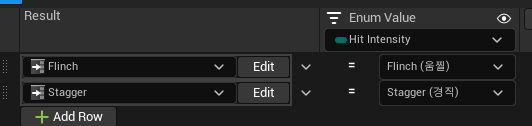 앞서 우리는 움찔, 경직, 넉백의 3가지 유형의 피격 모션을 구분해 두었다고 했다. 여기서 Flinch(움찔)은 캐릭터의 모션을 캔슬하지 않고 재생되어야 한다. 예컨대 캐릭터가 공격 중에 움찔 에 해당하는 공격을 맞게 된다면 캐릭터의 모션은 공격이 그대로 되지만 고개만 뒤로 젖혀지는 블랜딩이 있어야 한다. 그 외에 경직과 넉백은 진행 중이던 애니메이션을 캔슬하고 해당 애니메이션을 재생해야 하지만 또 구르기 중에는 경직에 해당하는 공격에는 캔슬되지 않아야 한다. 이런 조건을 고려해서 블루프린트로 피격 모션을 만들어 보자. 왜 블루프린트인가 하면 애님 몽타주를 다루는 작업이기에 바로바로 시각적으로 변화하는 모습을 에디터 상에서 관찰하면서 작업하는 게 용이하다고 판단했기 때문이다.