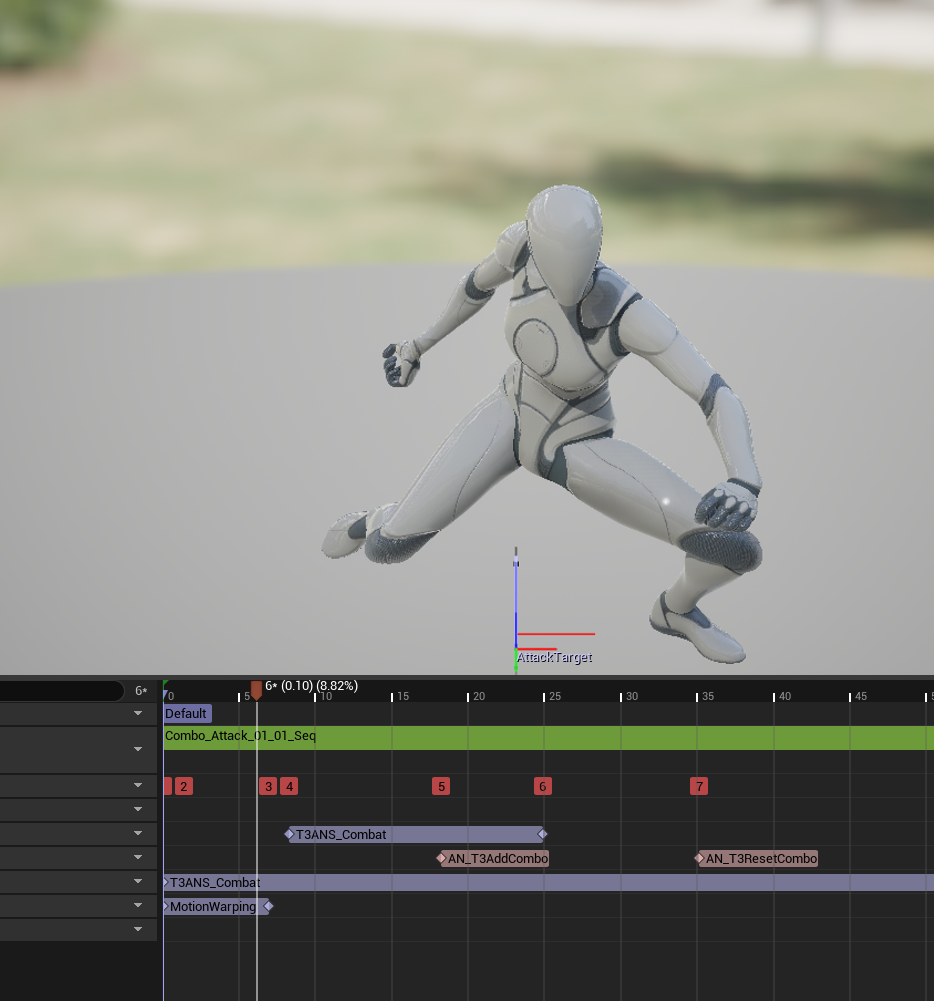 플러그인을 정상적으로 활성화 해 주었다면 애님 몽타주에서 노티파이 트랙을 추가해 주고 새 노티파이 스테이트를 추가해주려 할때 해당 항목에 MotionWarping 항목이 추가될 것이다. 우리는 해당 노티파이 스테이트를 추가해주고 구간을 모션 중에서 이동할 때 나올만한 구간으로 지정해 준 다음 디테일 패널에서 WarpTargetName을 AttackTarget으로 지정해 준다.