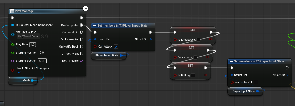 이렇게 하면 캐릭터의 넉백, 기상의 한 사이클이 완성된다만, 넉백과 기상 중에 공격이 되면 안 되기 때문에 앞서 공격과 구르기 등이 불가능하도록 변수들을 조정해 주었는데 해당 사이클의 끝에 조정했던 변수들을 원복 시켜줘야 그다음 행동이 가능할 것이기에 다음처럼 PlayMontage의 끝에 작업을 해준다.