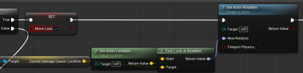 그렇기에 위의 사진에서의 Lying 섹션이 필요한 것이다. 플레이어의 입력이 있기 전까지 캐릭터는 누워있는 것을 지속해야 하기에 누워있는 자세를 유지할 필요가 있는 것이다. 이제 몽타주 작업은 끝났으니 캐릭터 블루프린트로 넘어가서 우리가 작성한 로직을 수정해보도록 하자. 일전에 우리는 캐릭터가 캐릭터가 바라보는 방향의 반대로 넉백 되게끔 했었다. 그렇기에 캐릭터가 오른쪽에서 피격을 당해도 캐릭터는 왼쪽이 아닌 뒤로 날아가게끔 되어 있다. 그렇기에 다음처럼 로직을 작성해서 피격 순간 캐릭터가 공격한 대상을 바라보게끔 회전시키는 로직을 일단 추가해 주었다.