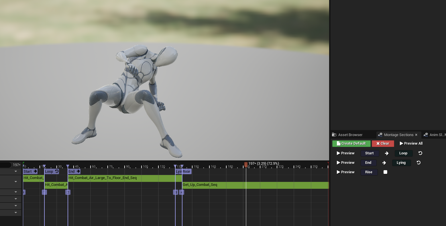 지난 글을 통해서 우리는 넉백으로 인해 캐릭터가 넘어지는 모션을 구현했었다. 하지만 영상을 보면 알겠지만 캐릭터가 넘어지는 모션이 종료되고 나서 바로 기상하는 것을 볼 수 있다. 자연스러운 기상 애니메이션을 추가해서 캐릭터가 넉백에서 회복되는 한 사이클을 구현해보려고 한다. 그렇기 위해선 이전에 작업했던 넉백 몽타주에 적절한 기상 애니메이션 시퀀스를 찾아서 추가해 준 다음 섹션작업을 해주어야 한다.
