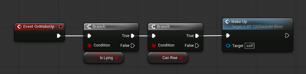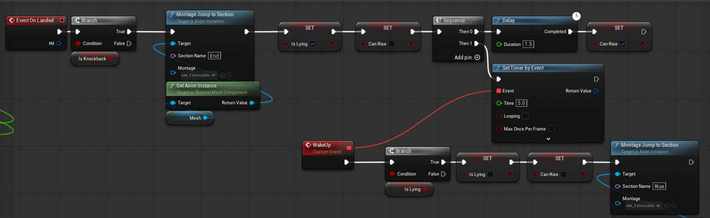 몽타주 섹션이 End로 넘어가서 Lying 루프에 걸려있는 동안 bIsLying이라는 bool 변수를 true로, bCanRise라는 변수를 False로 해서 누워있는 상태에 기상입력을 하지 못하는 상태로 만든다. 그다음 1.5초의 딜레이 이후에 bCanRise를 True로 해서 기상 입력이 유효하게 함과 동시에 5초의 타이머를 세팅해 준다. 해당 타이머가 종료되면 WakeUp이라는 커스텀 이벤트가 동작하여 bIsLying이 true인지 체크한 후 false로 전환, CanRise를 false로 전환해 준 뒤 몽타주 섹션을 Rise로 점프시켜 준다.