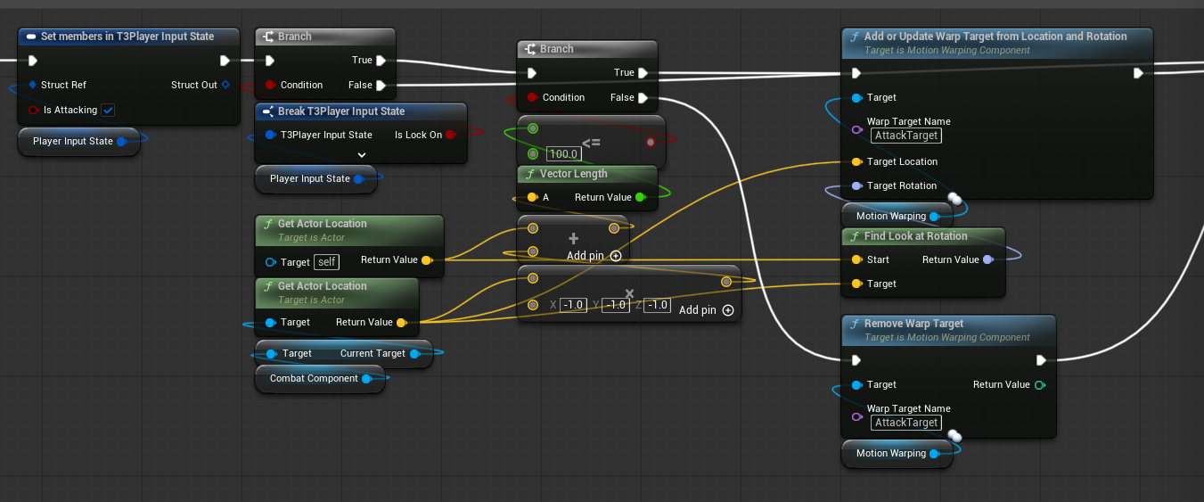 이제 캐릭터 블루프린트로 이동해서 Add or Update Warp Target from Location and Rotation 노드를 꺼내준다. 이 노드는 위치와 회전으로부터 타깃의 좌표를 얻고 이를 업데이트 해주는 함수이다. 즉 모션워핑이 시작될 때 이동할 좌표를 갱신해주는 노드이다. 우리는 공격이 Lock On 상태일 때에만 모션워핑 기능이 사용되어 적을 추적하는 느낌을 얻는것을 원한다. 그렇기에 일단 bLockOn이라는 변수가 true인지를 체크해주는것이 처음이며, 그 다음 멀리 있는 적한테 순간이동해서 떼리는 것은 원하지 않기 때문에 모션 워핑이 작동하는 거리의 제한을 줄 것이다. 다행히도 Lock On 로직 중에서 타겟 액터를 담는 변수가 존재하기 때문에 해당 변수를 이용해서 로직을 구현해줄 것이다.